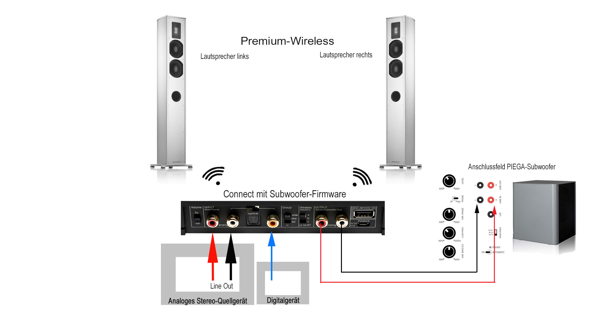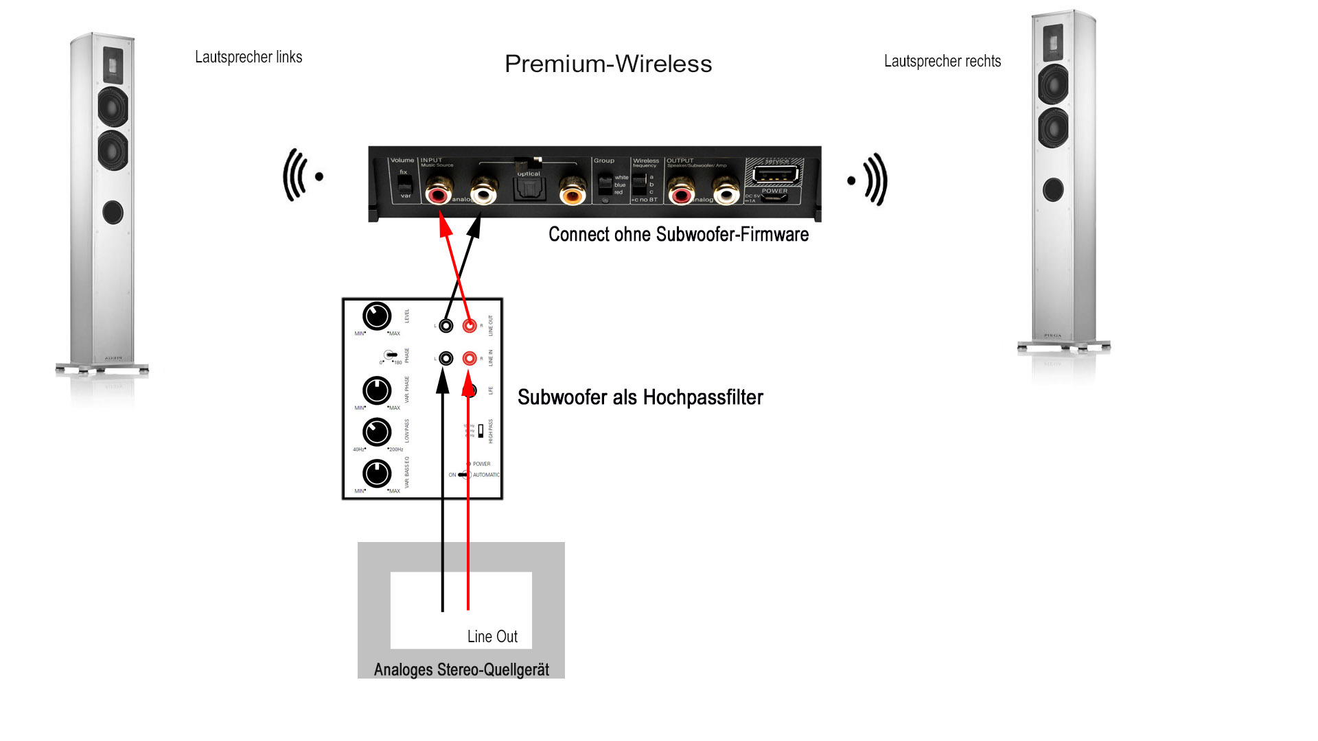 Im Schaltbild bekommt der Connect in dieser Variante das vom Subwoofer gefilterte/geregelte Signal und schickt das bearbeitete Signal auf die Funkstrecke