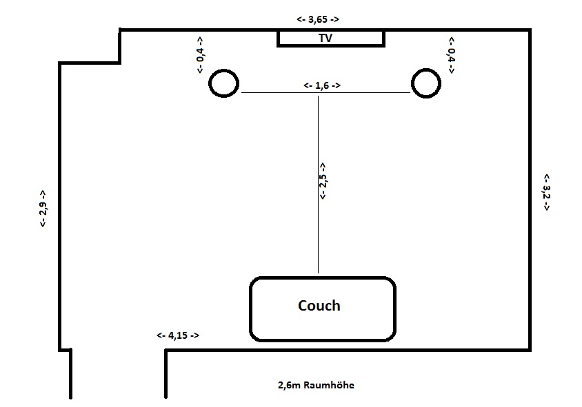 "Mein" grösstes Problem mit dem Raum wäre die eher geringe Tiefe (2.9m?). Damit kannst du deine Lautsprecher nicht wirklich von der Wand wegstellen. Wäre es auch möglich, die Breite des Raums (3.9m?) zu nutzen? Du wirst kaum eine richtige Bühnentiefe generieren können, wenn die Lautsprecher an der Wand kleben. Gemäss meiner Erfahrung sollten die meisten Lautsprecher (resp. deren Schallwand) mindestens einen Meter von der Wand wegstehen (besser 1.5m!), damit sich die "flache" Bühnenprojektion in eine tolle räumliche (tiefe) Bühne verwandelt. Dürfte aber auch mit 3.9m Raumtiefe schwierig werden.