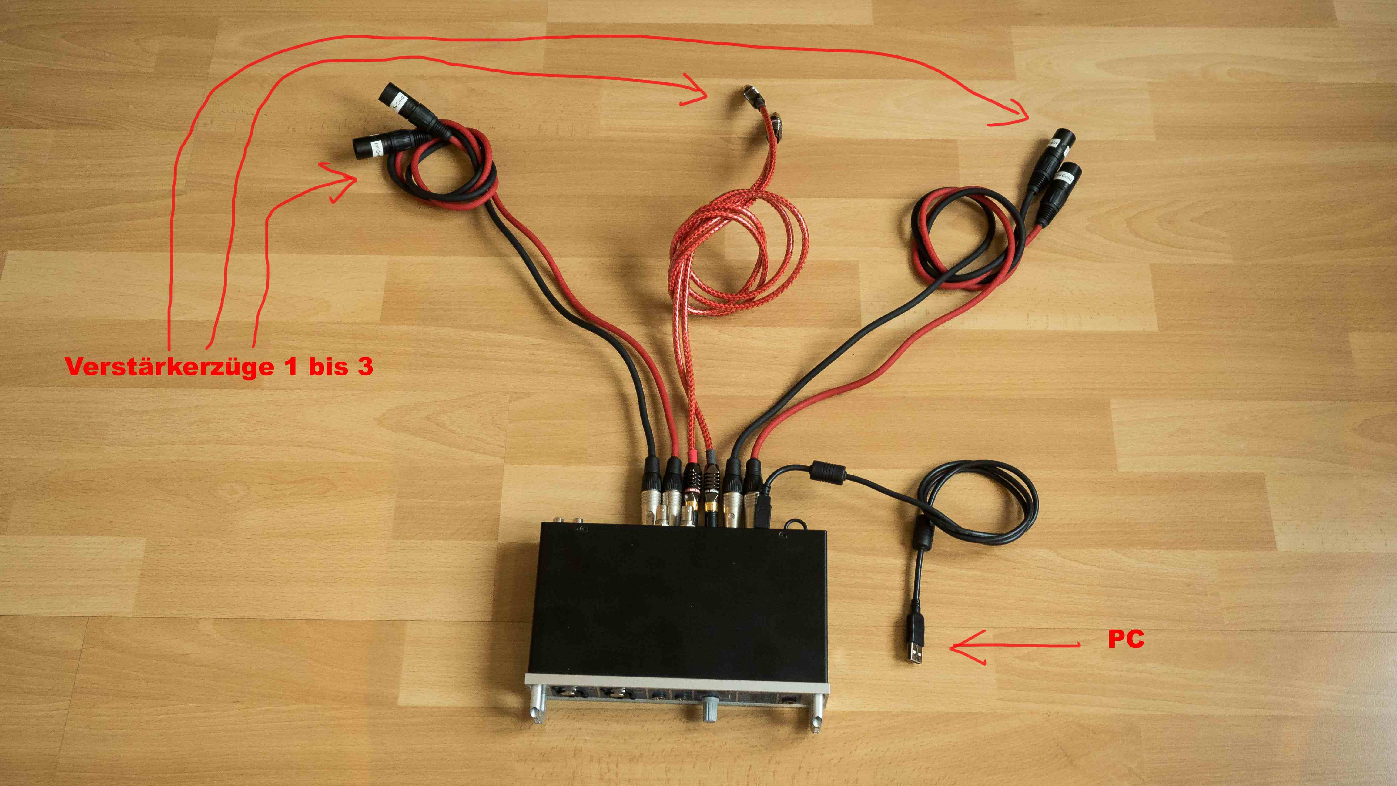 Vom PC geht's durch das Interface auf die drei Ausgänge. Das Interface erkennt automatisch symmetrische/asymmetrische Anschlüsse. Die Pinbelegung bei den XLR-Kabeln wurde natürlich beachtet. Kein Voodoo bei den Strippen: symm. Mikrofonkabel/Neutrik-Stecker.
