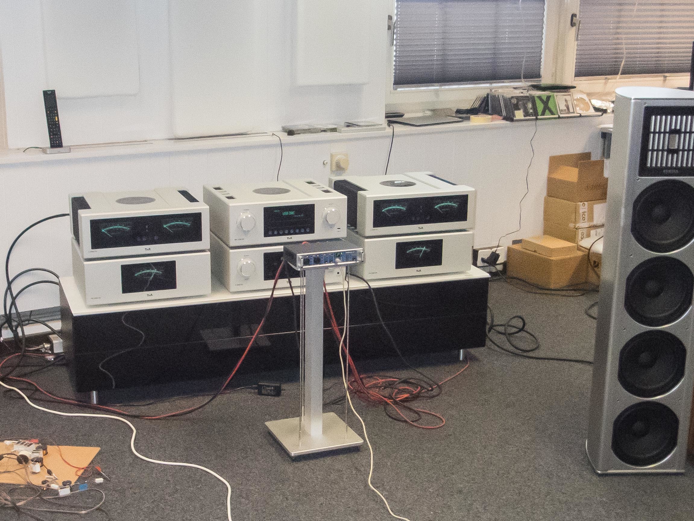 Auf technischer Seite sind wir diesmal für die Hörchecks etwas anders vorgegangen. Wichtigstes "Elektrogerät" war ein USB-Interface von RME für das Notebook. Es ermöglicht, auf Knopfdruck einen Eingang auf drei verschiedene Ausgänge zu legen und dabei sogar noch den Pegelabgleich der drei Ausgänge auf 0,1 dB genau zu regeln. Vollverstärker, gebrückte T&A-Stereoendstufen, „simple“ Stereoendstufe oder der Vergleich zu Aktiv-LS ... alles ist auf Knopfdruck möglich.