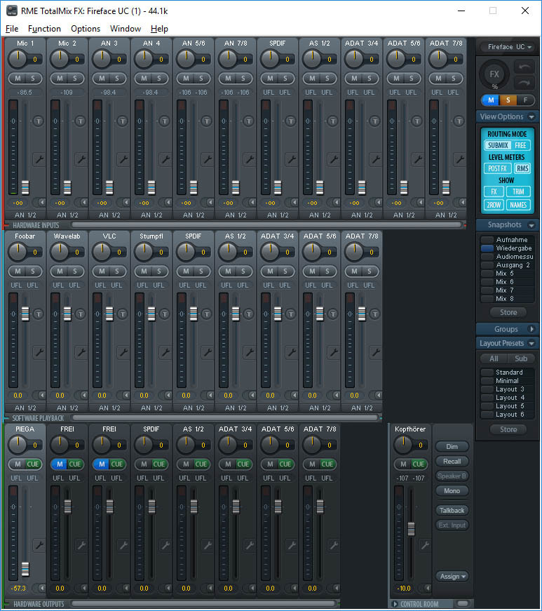 Daneben gibt's noch meherere Menüs für die ganzen Konfigurationen und eine Ansicht für die diversen Routingoptionen (welcher Eingang auf welchen Ausgang).