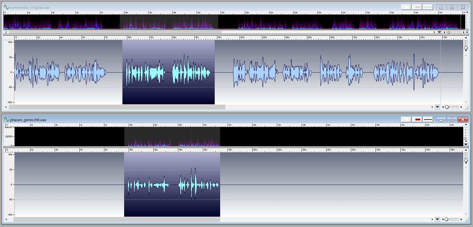 Und so sieht das Ergebnis aus. Oben die Ursprungsdatei, unten die Zusammenmischung. Ihr seht, dass sich die unveränderten phaseninvertierten Bereiche komplett ausgelöscht haben (eine perfekte gerade Linie). Die Veränderungen in dem Bereich mit dem EQ sind deutlich erkennbar. Wird jetzt dieser EQ-bearbeitete Bereich abgespielt, hört man so etwas wie eine "Telefonstimme", beim Rest ist absolute Stille.