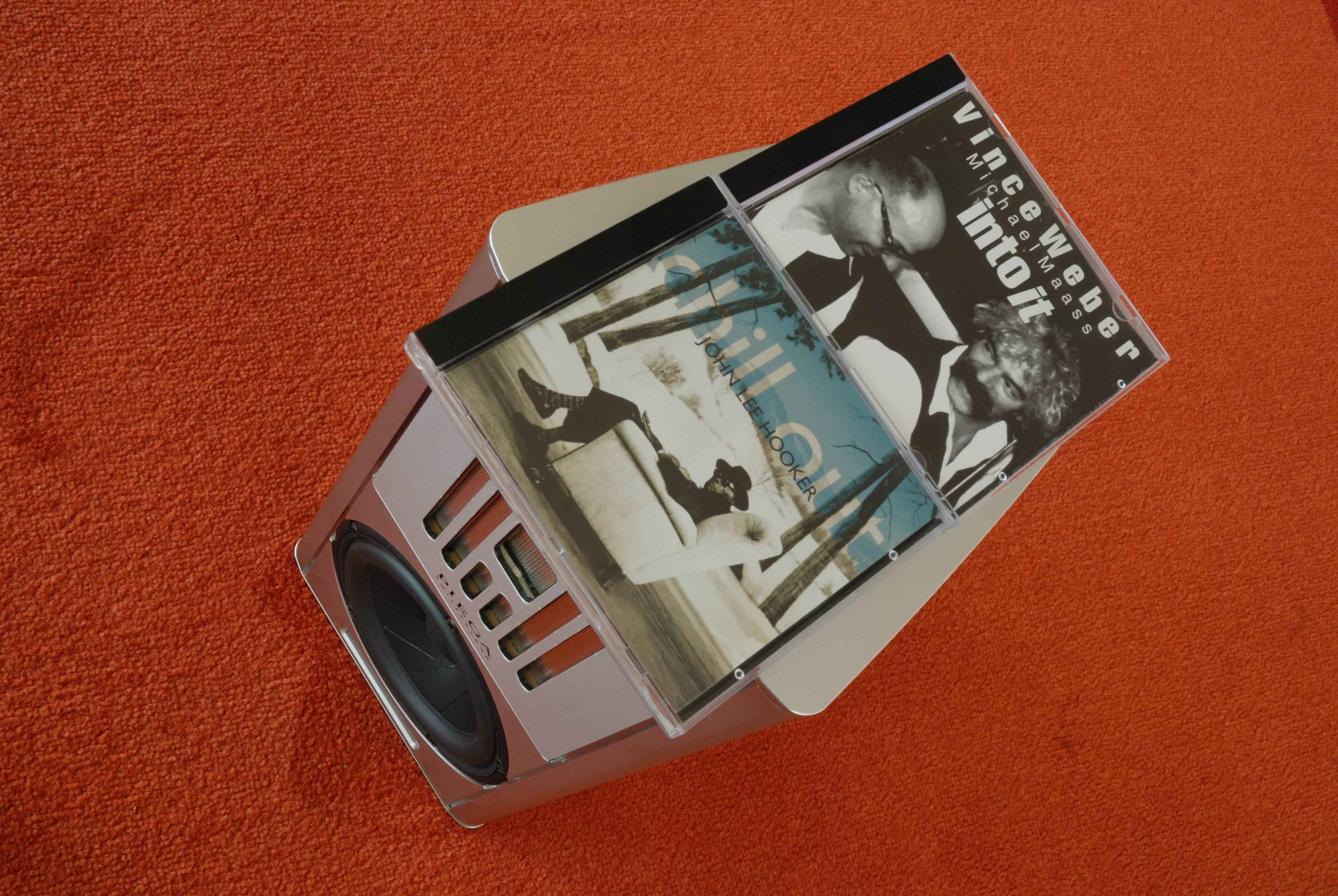 Die Membran des Tieftöners ist wirklich in etwa so groß wie eine CD. Die Grundfläche beträgt so ungefähr 2 CD. Die Vince Weber-CD liegt bündig an der hinteren Kante des Gehäuses.