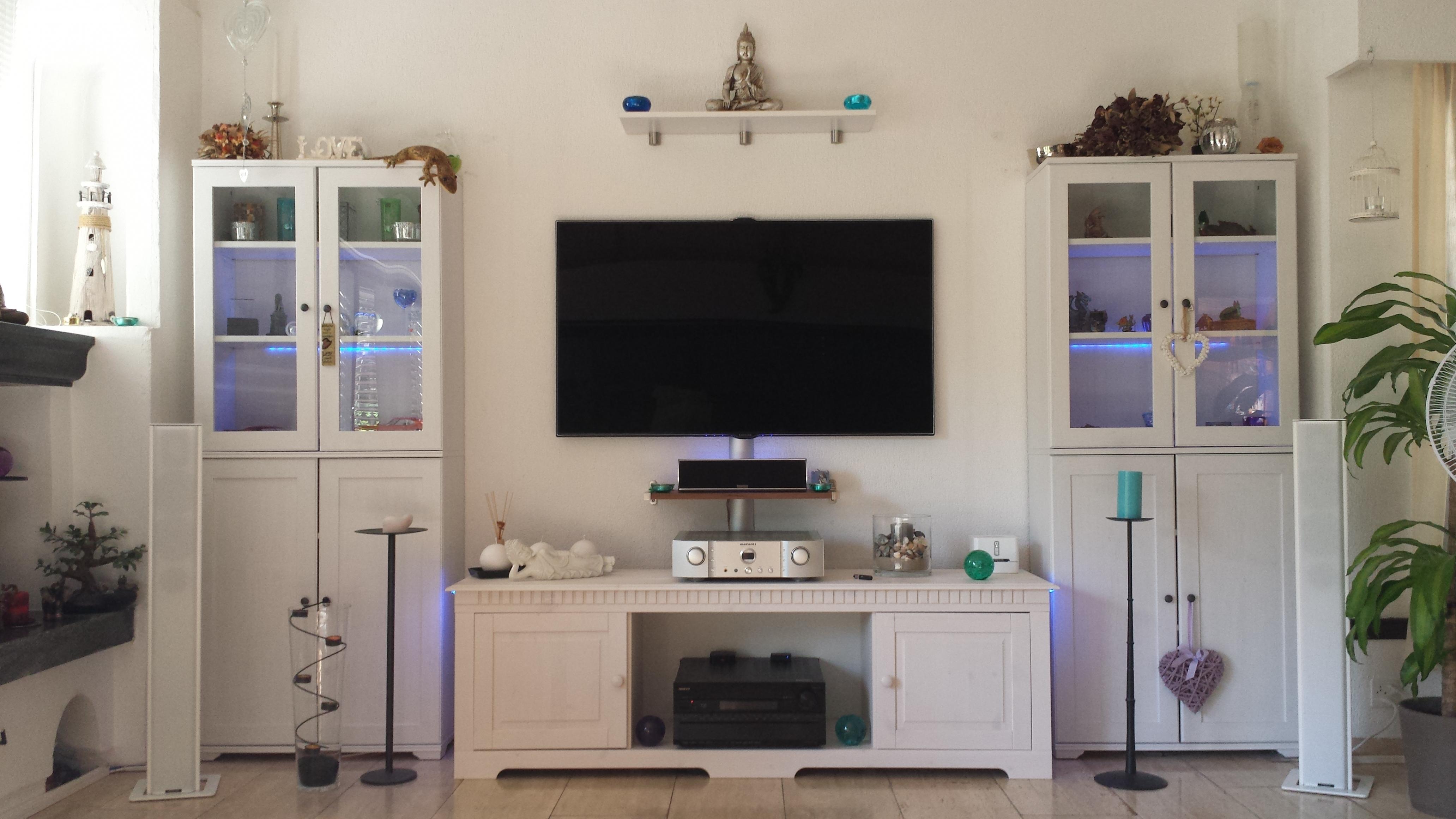Mein Wohnzimmer ist ca 18qm gross und rechteckig. Der Hörabstand beläuft sich auf ca 2.5m. Wandabstand der LS ca 30cm.