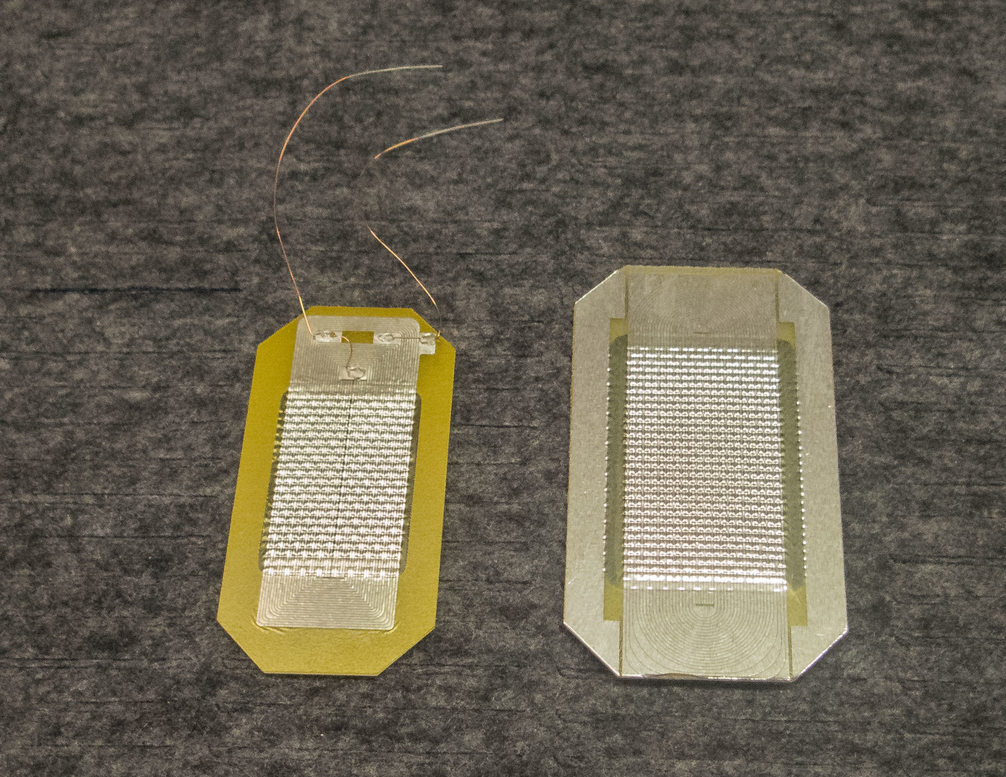 Das mäanderförmige Spulenlayout wurde – genau wie beim Koax – enger „gepackt“. Der Abstand zwischen den Leiterbahnen beträgt unglaubliche 0,075 mm. Es ist wohl im Augenblick eine Grenze bei der Herstellung der Folie erreicht, was die „Packungsdichte“ der Spule, die Prozesssicherheit und somit den Ausschuss angeht. Die Abstände der „Spulendrähte“ sind so klein, dass sie nur noch unter ganz besonderen Lichtbedingungen zu erkennen sind.