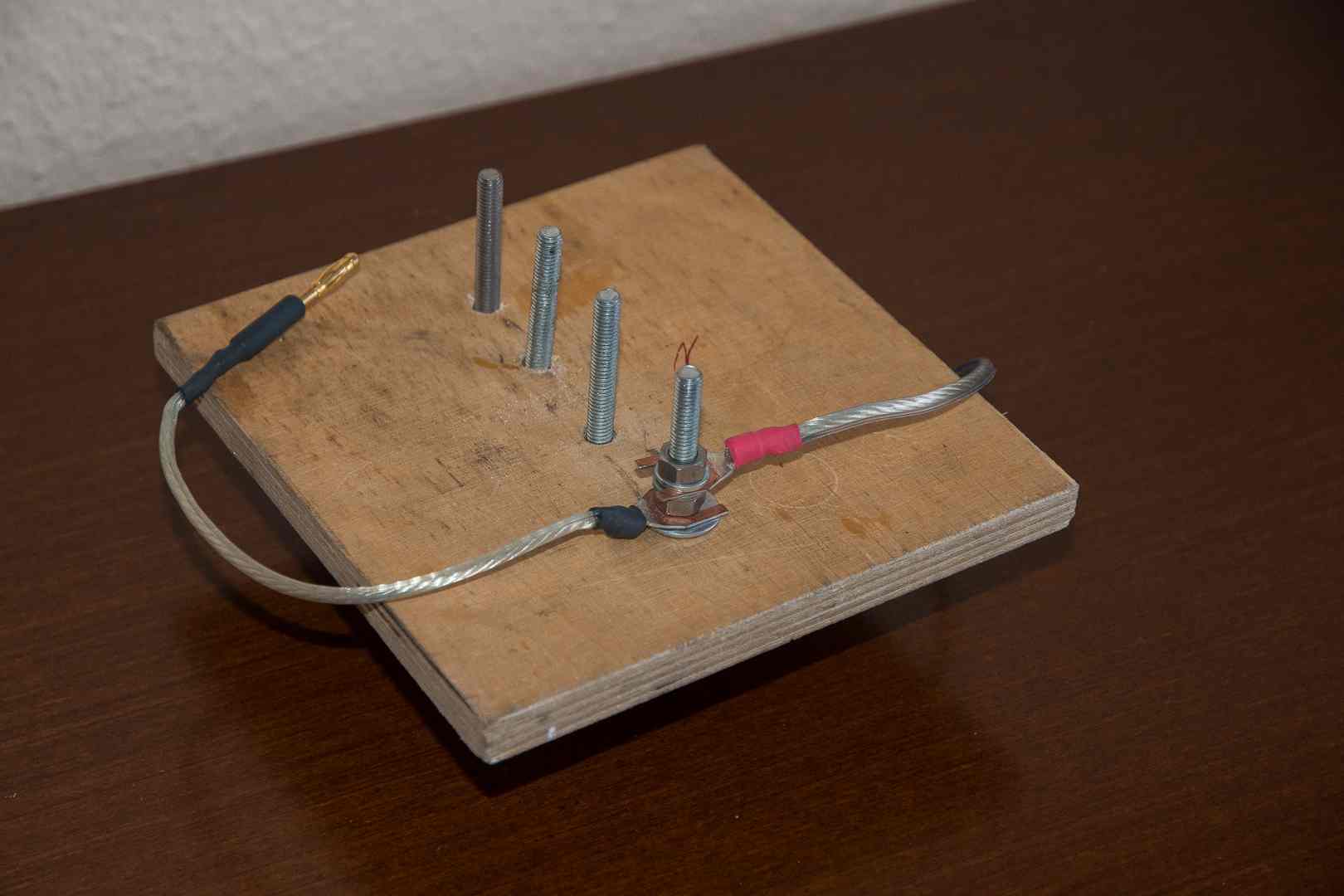 War jetzt alles quick & dirty, die Schrauben sind aus verzinktem Eisen, die Muttern und Scheiben aus der Kramkiste und die Kabel haben die falsche Farbcodierung. Ich hab' auch nur eine Schraube mit Muttern versehen, ich denke, der Rest dürfte sich selbst erklären.